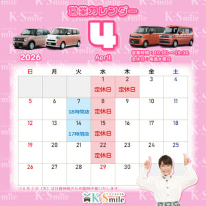 4月定休日のお知らせ 2026年3月26日 k-smileizumo ブログ, 新着情報 4月定休日のお知らせ📢 ケイスマイルの4月定休日についてのご案内です🌸 🔴営業時間:10時〜18時30分 🔴定休日:毎週水曜日 ※祝日は営業します ⭐️第一火曜日:18時閉店 ⭐️第二火曜日:17時閉店 ⭐️4月2日(木)は社内研修のため臨時休業いたします。 4月もどうぞ、 ケイスマイルをよろしくお願いいたします😊